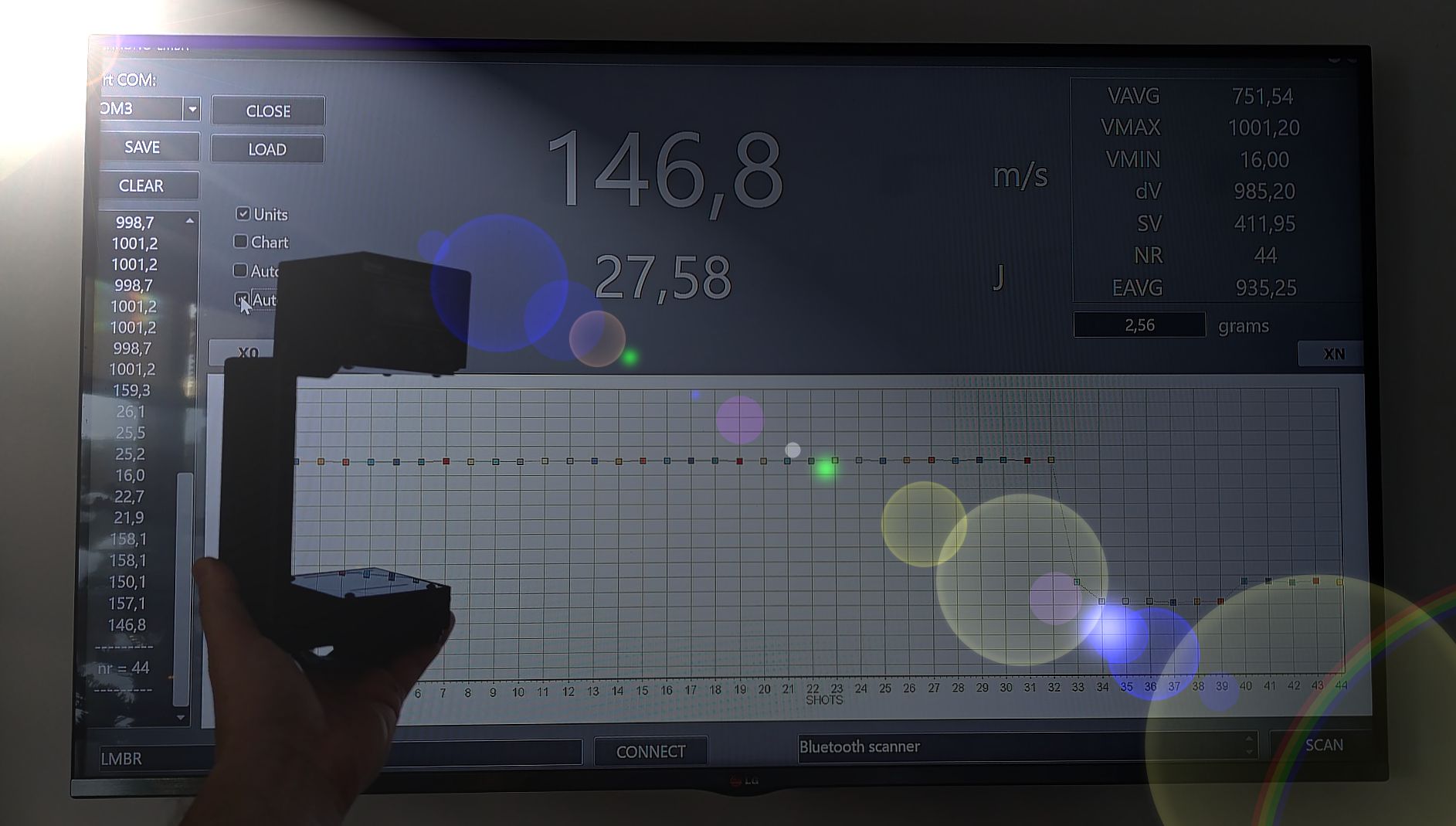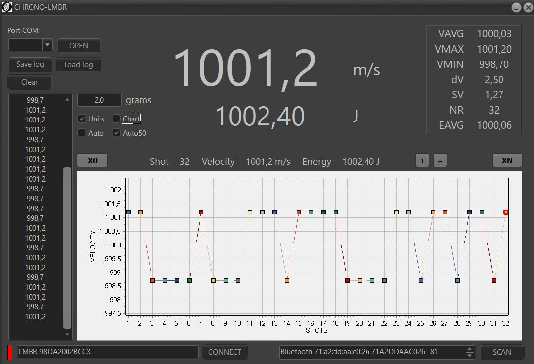 Live view with large, clear readouts of velocity (V) and energy (E). Instant statistics: Min, Max, Average, Extreme Spread (ES), Standard Deviation (SD). Real-time scatter plot visualization of shot series.