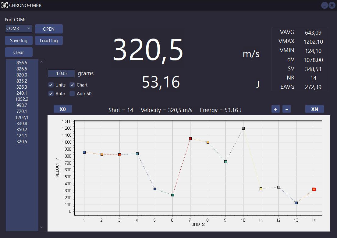 Live view with large, clear readouts of velocity (V) and energy (E). Instant statistics: Min, Max, Average, Extreme Spread (ES), Standard Deviation (SD). Real-time scatter plot visualization of shot series.